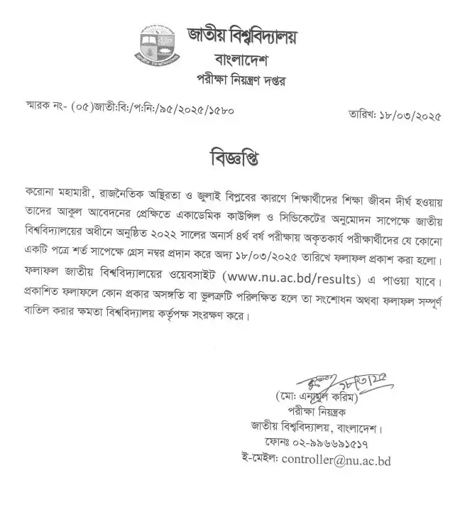 NU Honours 4th Year Result 2025 via Mobile SMS